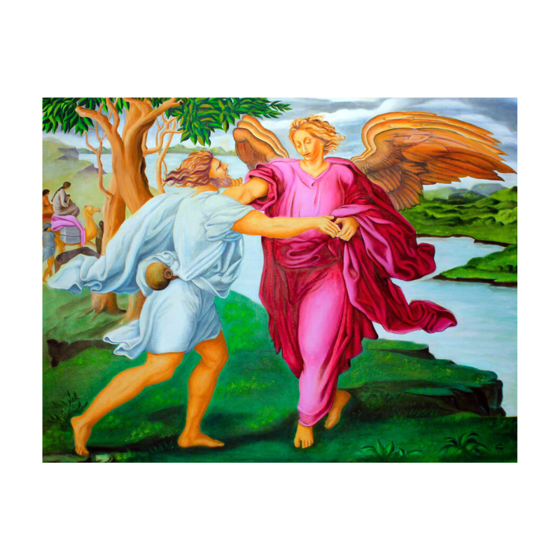 This painting portrays a famous biblical story of Jacob’s fight with the angel. The angel represents the different voices in our head that are limiting and destroying us. To progress in life, we constantly have to fight these voices.